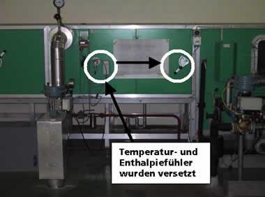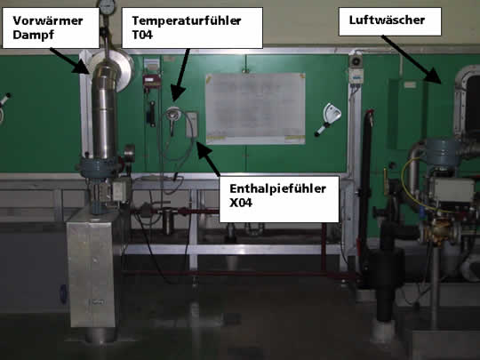 Am Dampflufterhitzter wurden starke Schichtungen festgestellt. Die Schichtungen führten dazu, dass der Enthalpiefühler X04 falsche Werte erfasste. Dies bewirkte, dass gleichzeitig gekühlt und geheizt wurde. Durch die starke Oberflächentemperatur des Vorwärmers, mit entsprechender Abstrahlung, erfasste der Temperaturfühler T04 (Thermoelement PT100) zu hohe Werte, was zu Grenzwertverletzungen und Anlagenstörungen führte. Auf die Leistungsgrenzen des Luftwäschers beim Betrieb als Kühlwäscher mit Brauchwasser wurde bereits hingewiesen [1].