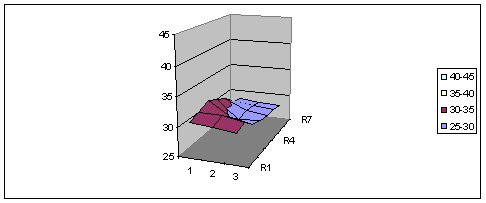 Dieses Bild ist ziemlich ähnlich wie das nach dem Lufterhitzer, jedoch etwas flacher. Immer noch ist der Bereich mit den höchsten Temperaturen oben rechts. Die Schichtung nach dem Lufterhitzer und nach dem Lochblech ist ähnlich. Nun interessiert, ob der Einbau der Drallelemente an der Schichtung etwas verändert! 5.4 nach Einbau, Ventil 30 % geöffnetBeschreibung der Situation: Stellbefehl auf Ventil 30 % Stellbefehl Ventilatordrehzahl 36 % Drallelement eingebaut Bemerkung -